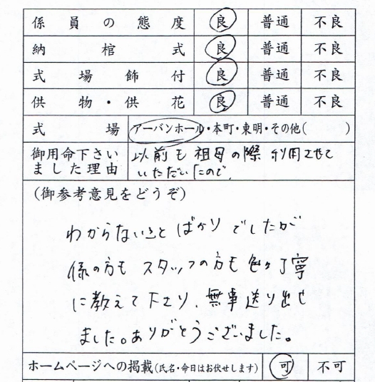 わからないことばかりでしたが、係の方もスタッフの方も色々御丁寧に教えて下さり、無事送り出せました。ありがとうございました。