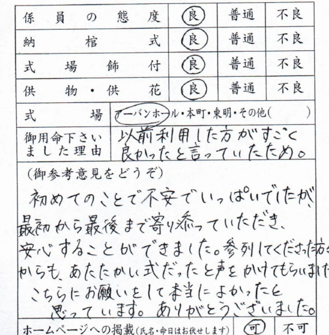 初めてのことで不安でいっぱいでしたが、最初から最後まで寄り添っていただき、安心することができました。 参列してくださった方々からも、あたたかい式だったと声をかけてもらいました。 こちらのお願いをして本当に良かったと思っています。ありがとうございました。