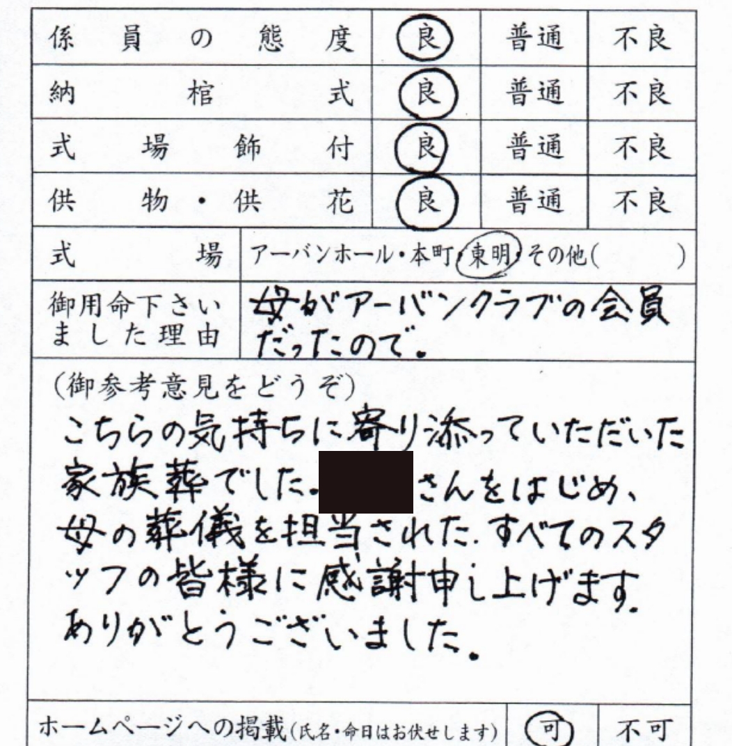 こちらの気持ちに寄り添っていただいた家族葬でした。担当スタッフさんをはじめ、母の葬儀を担当された、すべてのスタッフの皆様に感謝申し上げます。ありがとうございました。