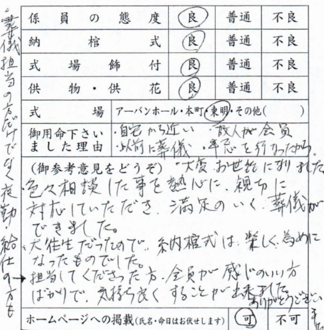 大変お世話になりました。色々相談した事を熱心に親切に対応していただき、満足のいく葬儀ができました。大往生だったので、納棺式は楽しく為めになったものでした。葬儀担当の方だけでなく夜勤・給仕の方も胆道してくださった方、全員が感じのいい方ばかりで、気持ち良くすることが出来ました。ありがとうございました。