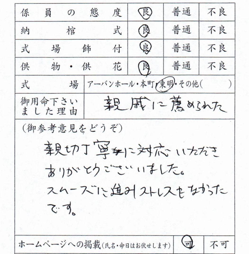 親切丁寧に対応いただきありがとうございました。スムーズに進みストレスもなかったです。