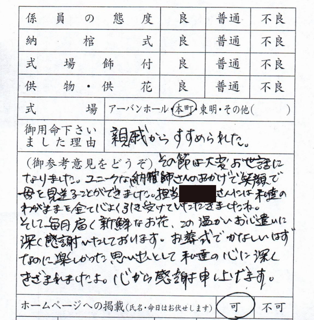 その節は大変お世話になりました。ユニークな納棺師さんのおかげで笑顔で母を見送ることができました。担当さんには私たちのわがままをすべて快く引き受けていただきましたね。 そして毎月届く新鮮なお花、この温かいお心遣いに深く感謝いたしております。お葬式で悲しいはずなのに楽しかった思い出として私たちの心に深く刻まれました。心から感謝申し上げます。
