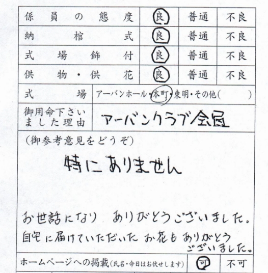 お世話になりありがとうございました。自宅に届けていただいたお花もありがとうございました。