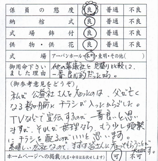 私が公益社さんを知ったのは、父が亡くなる数か月前にチラシが入ったからでした。 TVなどで宣伝するのが一番良いと思いますが、それが無理ならもう少し頻繫にチラシを配るのがいいと思います。 素晴らしい会社なので、まずは皆さんに知ってもらうことが大切です。