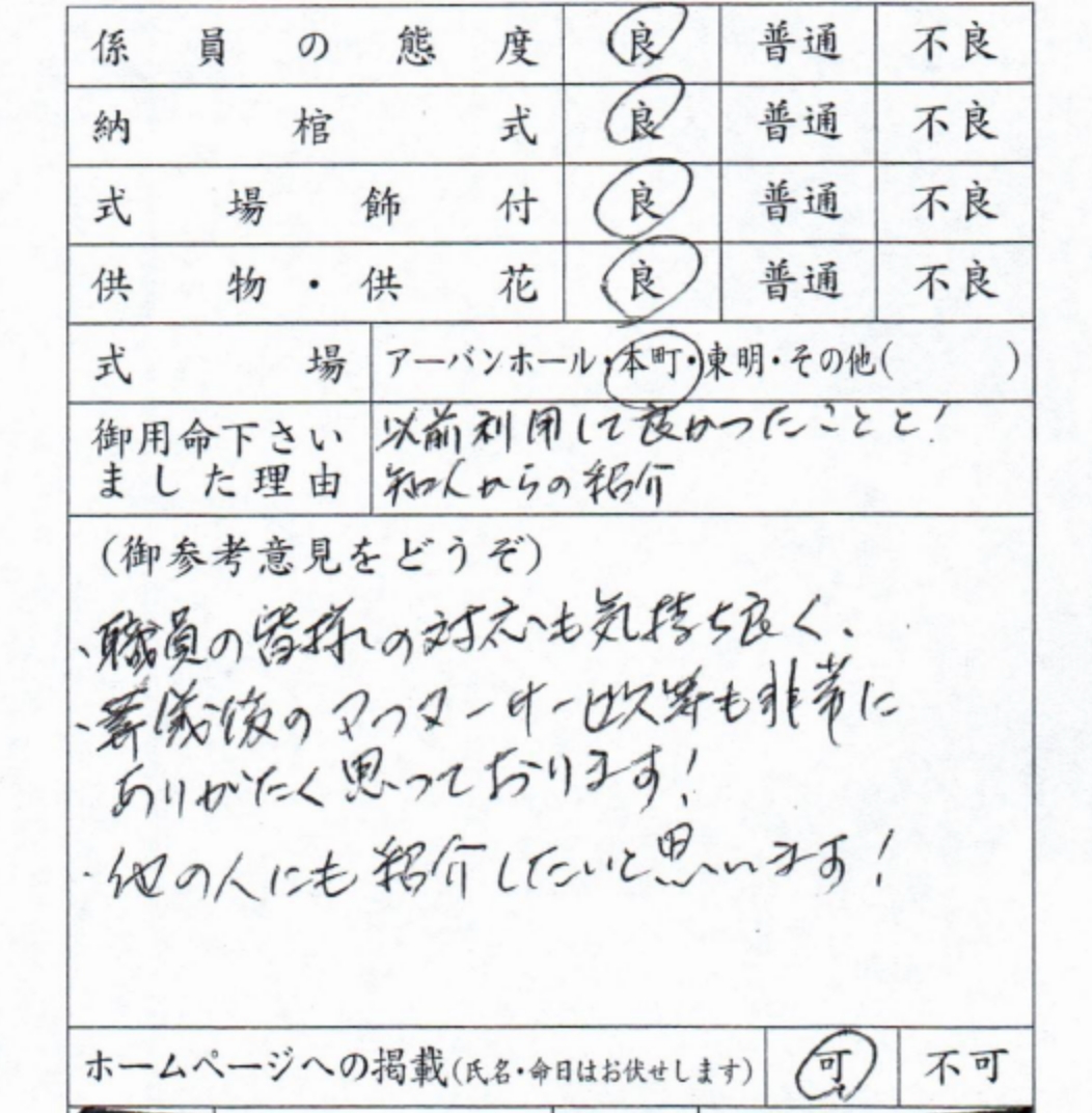 職員の皆様の対応も気持ち良く、葬儀役のアフターサービス等も非常にありがたく思っております!他の人にも紹介したいと思います!