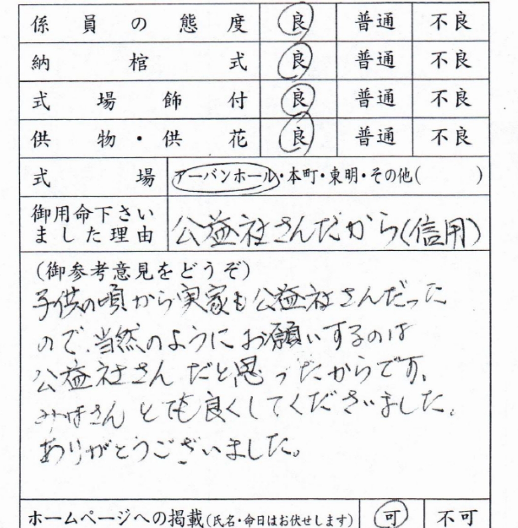 子どもの頃から実家も公益社さんだったので、当然のようにお願いするのは公益社さんだと思ったからです。 みなさんとても良くしてくださいました。ありがとうございました。