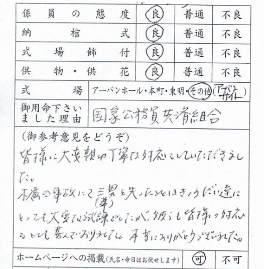 皆様に大変親切丁寧な対応をしていただきました。 不慮の事故にて三男を失ったときは兄弟達にとっても大変な試練でしたが、彼らも皆様の対応をとても喜んでおりました。本当にありがとうございました。