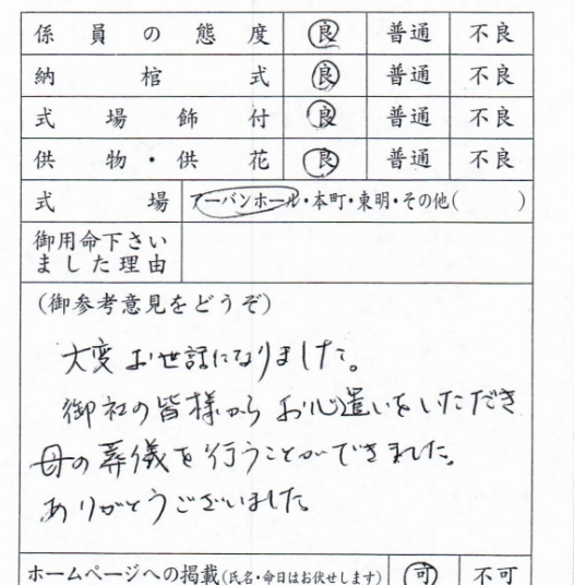御社の皆様からお心遣いをいただき母の葬儀を行うことができました。ありがとうございました。