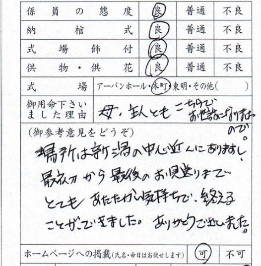 場所は新潟の中心近くにありますし、最初から最後のお見送りまでとてもあたたかい気持ちで、終えることができました。ありがとうございました。