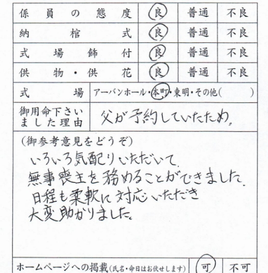 いろいろ気配りいただいて、無事喪主を務めることができました。 日程も柔軟に対応いただき、大変助かりました。