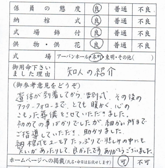 遺体が到着してから告別式、その後のアフターフォローまで、とても温かく心のこもった葬儀をさせていただきました。