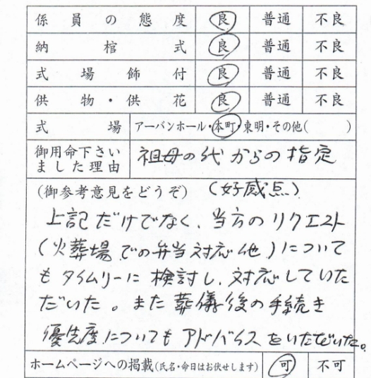 上記だけでなく、当方のリクエスト(火葬場での弁当対応他)についてもタイムリーに検討し、対応していただいた。また葬儀後の手続き優先度についてもアドバイスをいただいた。