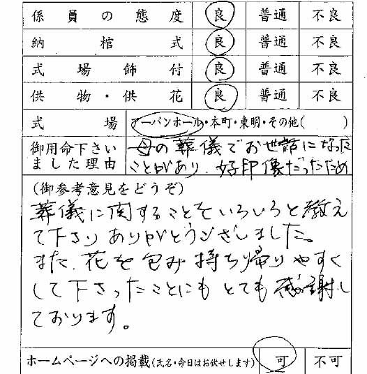 葬儀に関することをいろいろと教えて下さりありがとうございました。 また、花を包み持ち帰りやすくして下さったことにもとても感謝しております。