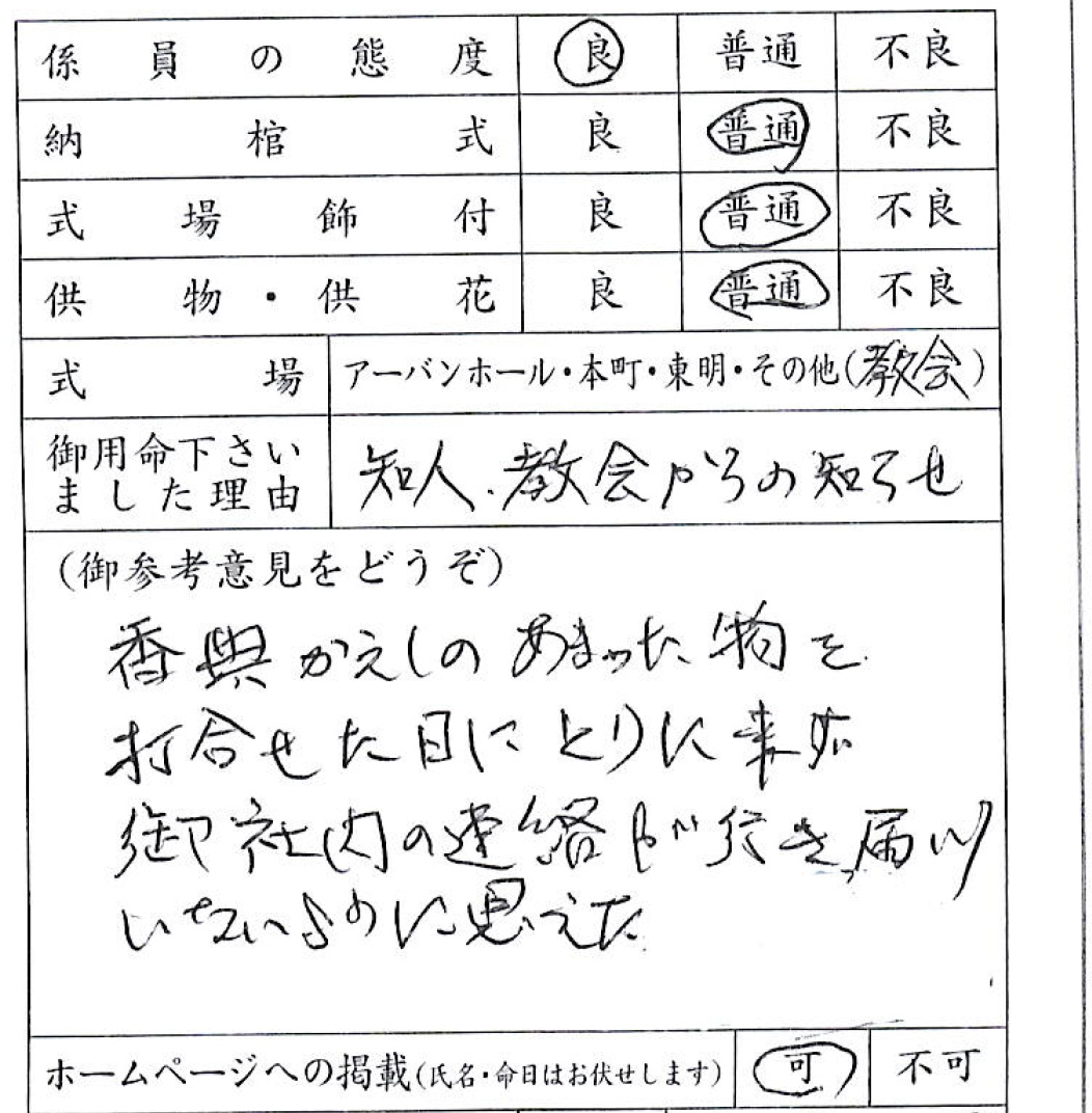 香典返しのあまった物を打合せた日にとりに来ず、御社内の連絡が行き届いていないように思えた。